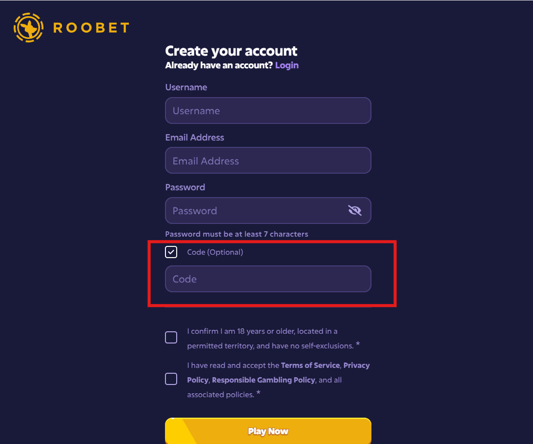 Enter the Roobet referral code in the designated field.